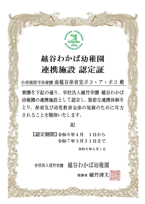 越谷わかば幼稚園は近隣の17園の小規模認可保育園(0~2歳までの保育の必要なお子さんをお預かりする施設)と連携して、小規模認可保育園卒園後の3歳児以降のお子さんが通える幼稚園となっております。